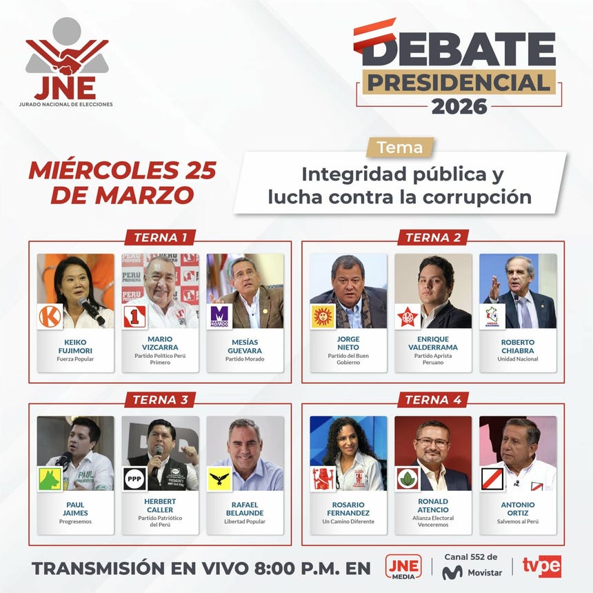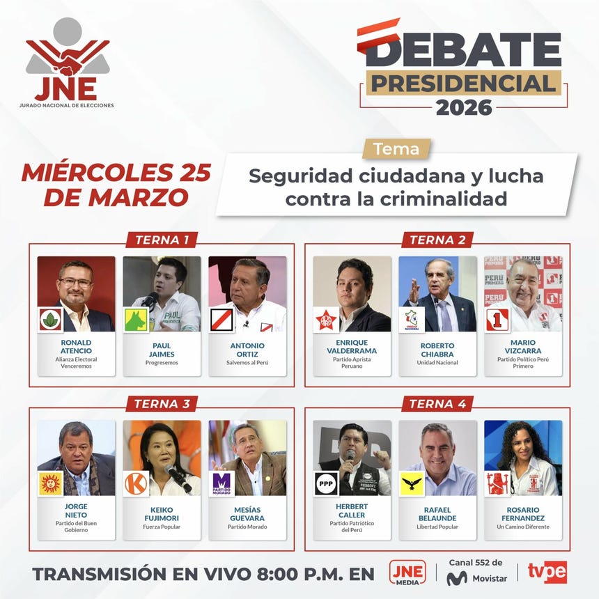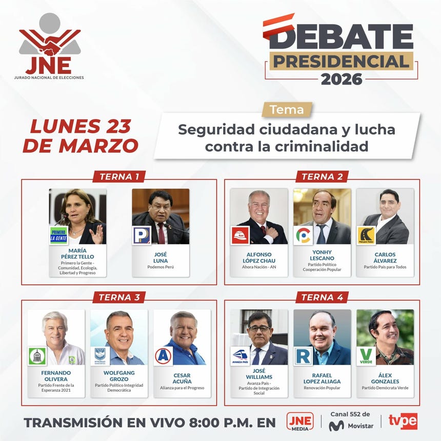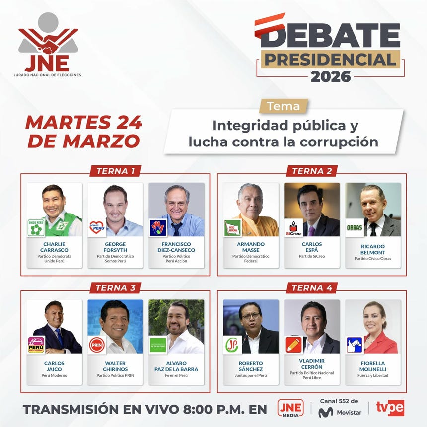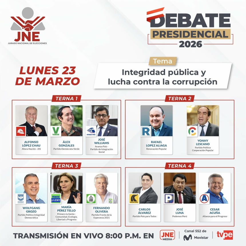 El Jurado Nacional de Elecciones (JNE) dará inicio este lunes a partir de las 8:00 p. m. al primer ciclo de debates presidenciales en el marco de las Elecciones Generales 2026.